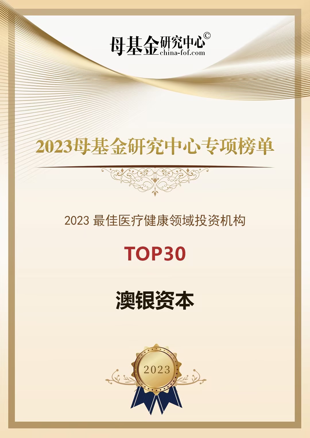 澳银资本凭借在医疗健康领域的持续深耕和优秀的投资业绩,荣膺2023母基金研究中心专项榜单“早期基金回报”投资机构榜、“医疗健康领域”投资机构榜、医疗健康领域投资人等三项子榜单!
