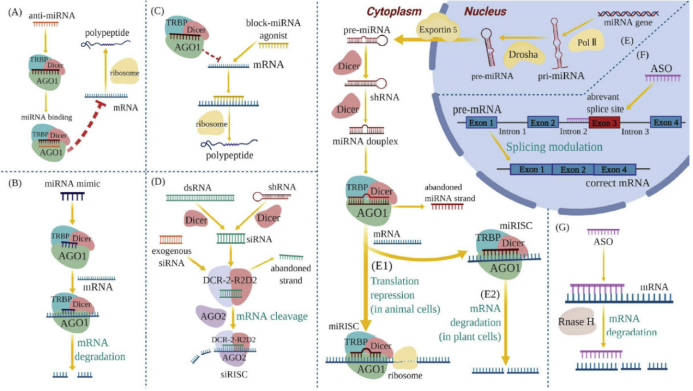通常,RNA疗法是通过利用细胞内的RNase H(G)或形成RNA诱导的沉默复合体(RISC)(D、E1、E2)来切割靶基因。在植物细胞中,miRNA与目标mRNA完全结合以降解(E1),而在动物细胞中,因其不能与其目标mRNA互补,后者阻止核糖体并减少翻译(E2)。ASO能够调节mRNA(F)的剪接过程。它通过与异常的mRNA剪接位点结合来纠正错误的剪接。